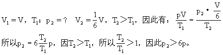 [分析解答]因为气缸绝热,所以热传递Q=0,而现用力将活塞推进,使体积减小,即外力对气体做功了,也就是气体的温度升高了,由气态方程可知pV=cT,只有当p'>6p时,pV乘积才可能是增加的。