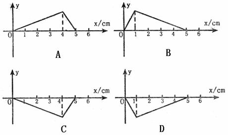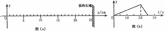4.将一根长为100多厘米的均匀弦线,沿水平的x轴放置,拉紧并使两端固定,如图(a)所示。现对离固定的右端25cm处(取该处的原点O)的弦上一点施加一个沿垂直于弦线方向(即y轴方向)的扰动,其位移随时间的变化规律如图(b)所示该扰动将沿弦线传播而形成波(孤立的脉冲波)。已知该波在弦线中的传播速度为2cm/s,下图中表示自O点沿弦右传播的波在t=2.5s时的波形图是( )