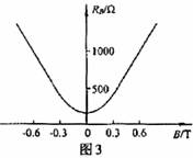 (4)某同学查阅相关资料时看到了图3所示的磁敏电阻在一定温度下的电阻-磁感应强度特性曲线(关于纵轴对称),由图线可以得到什么结论?