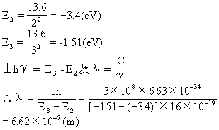 (3)计算这几条光谱线中波长最短的一条的波长。(其中静电力恒量K=9.0×109N·m2/C2,电子电量e=1.6×10-19C,普朗克恒量h=6.63×10-34J·s,真空中光速c=3.0×108m/s)。