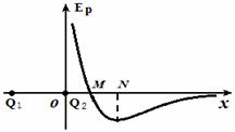 两个点电荷Q1、Q2固定于x轴上。将一带正电的试探电荷从足够远处沿x轴负方向移近Q2(位于座标原点O)。过程中,试探电荷的电势能Ep随位置变化的关系如图所示。则下列判断正确的是 ( )