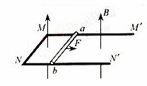 (10分)(2010年高考天津卷11.)如图所示,质量m1=0.1kg,电阻R1=0.3Ω,长度l=0.4m的导体棒ab横放在U型金属框架上。框架质量m2=0.2kg,放在绝缘水平面上,与水平面间的动摩擦因数μ=0.2,相距0.4m的MM’、NN’相互平行,电阻不计且足够长。电阻R2=0.1Ω的MN垂直于MM’。整个装置处于竖直向上的匀强磁场中,磁感应强度B=0.5T。垂直于ab施加F=2N的水平恒力,ab从静止开始无摩擦地运动,始终与MM’、NN’保持良好接触,当ab运动到某处时,框架开始运动。设框架与水平面间最大静摩擦力等于滑动摩擦力,g取10m/s2.