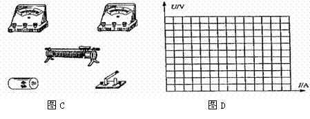 (3)用电流表和电压表测1节干电池的电动势和内电阻,如图中给出了A、B两个供选用的电路图,为了较精确地测定电动势和内电阻,实验中应选用 电路,正确选用电路后,根据图C所示的器材,请用实线表示导线,将图C中器材连成实验用电路,实验时经测量得出的数据如下表,请在下图D的方格纸上画出U-I图线。利用图线可求出电源电动势和内电阻分别为 、 。