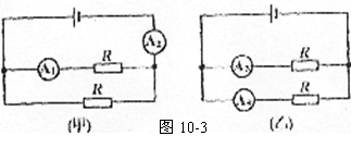 5.如图10-3所示的甲乙两种电路中,电源相同,各电阻器值相等,各电流表的内阻相等且不可忽略不计,电流表A1、A2、A3和A4读出的电流值分别为I1、I2、I3和I4,下列关系式中正确的是 ( )
