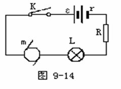 15、(16分)如图9-14所示,已知电源电动势ε=20V,内阻r=1Ω,当接入固定电阻R=4Ω时,电路中标有“3V 4.5W”的灯泡L和内阻r′=0.5Ω的小型直流电动机恰能正常工作,求(1)电路中的电流强度?(2)电动机的额定工作电压?(3) 电源的总功率? ![]()