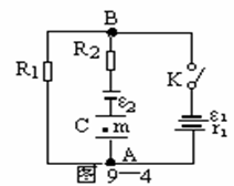 16、(16分) 如图9-4所示,ε1=3V,r1=0.5Ω,R1=R2=5.5Ω,平行板电容器的两板距离d=1cm,当电键K接通时极板中的一个质量m=4×10-3g,电量为q=1.0×10-7C的带电微粒恰好处于静止状态。求:(1)K断开后,微粒向什么方向运动,加速度多大?(2)若电容为1000pF,K断开后,有多少电量的电荷流过R2?