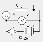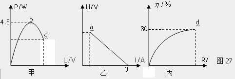 5、(13分)如图26所示,电源(E,r)由n个电动势E0均为1.5V,内阻均为r0的电池串联所组成(E=nE0,r=nr0),合上开关S,变阻器的滑动头C从A端滑至B端的过程中,电路中的一些物理量的变化由图27甲、乙、丙三个图给出,电表、导线对电路的影响不计。求:(1)组成电源的串联电池的个数n;(2)变阻器总阻值;(3)甲、乙、丙三个图上的a、b、c、d各点的坐标。(甲图为输出功率与路端电压关系曲线;乙图为路端电压与总电流关系曲线;丙图为电源的效率与外电路电阻关系曲线。这里的效率指电源的输出功率与总功率的比值。)
