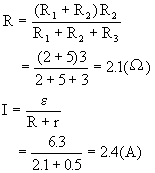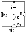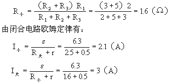 例1 如图9-1所示电路,已知电源电动势ε=6.3V,内电阻r=0.5Ω,固定电阻R1=2Ω,R2=3Ω,R3是阻值为5Ω的滑动变阻器。按下电键K,调节滑动变阻器的触点,求通过电源的电流范围。