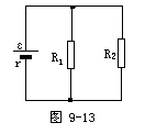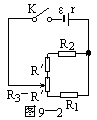 将图9-1化简成图9-2。外电路的结构是R′与R2串联、(R3-R′)与R1串联,然后这两串电阻并联。要使通过电路中电流最大,外电阻应当最小,要使通过电源的电流最小,外电阻应当最大。设R3中与R2串联的那部分电阻为R′,外电阻R为