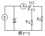 例2 在如图9-3所示电路中,R1=390Ω,R2=230Ω,电源内电阻r=50Ω,当K合在1时,电压表的读数为80V;当K合在2时,电压表的读数为U1=72V,电流表的读数为I1=0.18A,求:(1)电源的电动势(2)当K合在3时,两电表的读数。