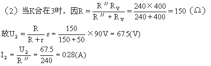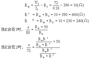 上述解答有一个错误的“替代假设”:电路中的电流表、电压表都是理想的电表。事实上,问题并非如此简单。如果进一步分析K合在2时的情况就会发现矛盾:I1R1=0.18×390=70.2(V)≠80V,这就表明,电路中的电流表和电压表并非理想的电表。