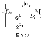 分析电路时应注意哪些是恒量,哪些是变量。图9-10电路中电源电动势ε是恒量,灯L1和L2正常发光时,加在灯两端电压和通过每个灯的电流是额定的。错解中对电键K闭合和断开两种情况,电路结构差异没有具体分析,此时随灯所在支路电流强度不变,两种情况干路电流强度是不同的,错误地将干路电流强度认为不变,导致了错误的结果。
