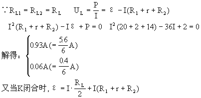 例6 如图9-10所示的电路中已知电源电动势ε=36V,内电阻r=2Ω,R1=20Ω,每盏灯额定功率都是2W,额定电压也相同。当K闭合调到R2=14Ω时,两灯都正常发光;当K断开后为使L2仍正常发光,求R2应调到何值?