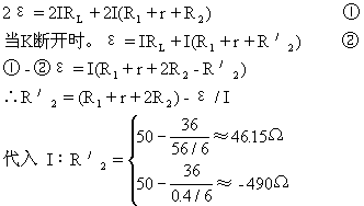 ①-②I(R1+r+2R2-R2′)=0 但I≠0,∴R1+r+2R2=R′2即R′2=20+2+2×14=50Ω