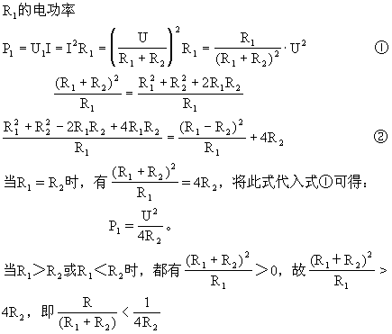因此,在这两种情况时,R1的电功率都是P1<U2/4R,且不难看出,Rl与R2差值越大,P1越小于U2/4R。