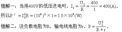 错解一是对欧姆定律使用不当,输送电压是加在输电线电阻和负载上的,如果把它考虑成输电线上的电压求电流强度当然就错了。错解二注意到了负载的作用,所求出的损失功率P1是正确的,然而在高压送电电路中,负载都是使用了变压器而错解二把它当作纯电阻使P2解错。