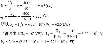例13 输电线的电阻共计10Ω,输送的电功率是100kw,用400V的低压送电,输电线上发热损失的功率是多少kw?改用10kV的高压送电,发热功率损失又是多少kw?