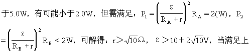 例14 把一个“10V 2.0W”的用电器A(纯电阻)接到某一电动势和内阻都不变的电源上,用电器A实际消耗的功率是2.0W,换上另一个“ 10V 5.0W”的用电器B(纯电阻)接到这一电源上,用电器B实际消耗的电功率有没有可能反而小于2.0W?你如果认为不可能,试说明理由,如果认为可能,试求出用电器B实际消耗的电功率小于2.0W的条件(设电阻不随温度改变)