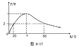 根据电源最大输出功率的条件做出输出功率与外电阻图(P-R图如图9-17所示)做定性分析,也可以得到同样的结果。由题意可知RA接入电路时,若电源的输出功率达到最大输出功率,则RB接入电路时,电源的输出功率肯定小于最大输出功率2W。若电源的输出功率没有达到最大输出功率,RB接入电路时,电源的输出功率有可能小于RA接入电路时输出功率2W。