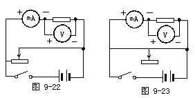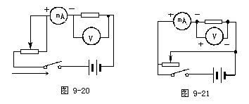 错解一:如图9-19所示,此种连法错在变阻器的右下接线柱和电源的负极之间少连了一条线,即使变阻器取最大值,通过电路的电流也超过了10mA,大于毫安表的量程。