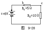 例17 如图9-28所示电路的三根导线中有一根是断的。电源电阻器R1·R2及另外两根导线都是好的。为了查出断导线,某学生想先用万用表的红表笔连接在电源的正极a,再将黑表笔分别连接在电阻器Rl的b端和R2的c端,并观察万用表指针的示数。在下列选挡中,符合操作规程的是: