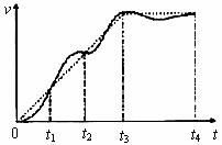 12、某人骑自行车在平直道路上行进,图中的实线记录了自行车开始一段时间内的v-t图象,某同学为了简化计算,用虚线作近似处理,下列说法正确的是---[ ]