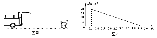 25、一辆长途客车正在以v=20m/s的速度匀速行驶,突然,司机看见车的正前方x=45m处有一只小狗(如图甲所示),司机立即采取制动措施. 从司机看见小狗到长途客车开始做匀减速直线运动的时间间隔△t=0.5s。若从司机看见小狗开始计时(t=0),该长途客车的速度-时间图象如图乙所示。求: