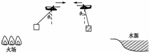 直升机沿水平方向匀速飞往水源取水灭火,悬挂着m=500 kg空箱的悬索与竖直方向的夹角θ1=45°.直升机取水后飞往火场,加速度沿水平方向,大小稳定在a =1.5 m/s2时,悬索与竖直方向的夹角θ2=14°.如果空气阻力大小不计,且忽略悬索的质量,试求水箱中水的质量M.(取重力加速度g =10 m/s2;sin 14°≈0.242;cos 14°≈0.970)