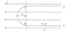 ”杆由两段相互平行的足够长的水平直杆PQ、MN和一半径为R的光滑半圆环MAP组成,固定在竖直平面内。其中MN光滑,PQ杆是粗糙的,现将质量为M的带正电荷的小环套在MN杆上,小环所受的电场力为重力的1/2。