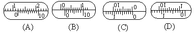 9、欲使游标卡尺两测脚间形成0.2毫米宽的缝,以便用来观察衍射现象,卡尺的游标应如下列图中的 ( )