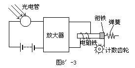 24.图8′-3是一种光电计数装置的原理图,被计数的制品放在传送带上,光源安装在传送带的一侧,光电计数装置安装在传送带的另一侧.每当传送带上有一个制品通过时,光线被挡住,电磁铁放开衔铁,计数齿轮转过一齿,计数器自动地把制品数目记下来.试说明这种计数装置的工作原理.