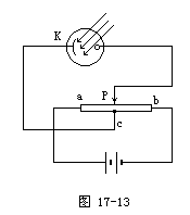 用图17-13所示装置研究光电效应现象,光阴极K与滑动变阻器的中心抽头c相连.当滑动头P从a移到c的过程中,光电流始终为零.为了产生光电流,可采取的措施是 [ ]