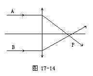 13.两束与主轴距离相等的单色可见光A和B,平行于主轴射向凸透镜,经透镜折射后相交于P点,如图17-14所示.则A、B两束光的光子能量的大小关系是EA____EB(填大于、等于、小于).