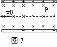 如图7所示,两平行、正对金属板水平放置,使上面金属板带上一定量正电荷,下面金属板带上等量的负电荷,再在它们之间加上垂直纸面向里的匀强磁场。一个带电粒子以某一初速度v0沿垂直于电场和磁场的方向从两金属板左端中央射入后向上偏转。若带电粒子所受重力可忽略不计,仍按上述方式将带电粒子射入两板间,为使其进入两板间后向下偏转,下列措施中一定不可行的是