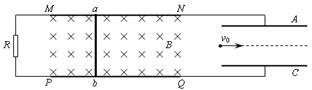 2.(18分)如图所示,MN和PQ是两根放在竖直面内且足够长的平行金属导轨,相距l=50cm。导轨处在垂直纸面向里的磁感应强度B=5T的匀强磁场中。一根电阻为r=0.1Ω的金属棒ab可紧贴导轨左右运动。两块平行的、相距d=10cm、长度L=20cm的水平放置的金属板A和C分别与两平行导轨相连接,图中跨接在两导轨间的电阻R=0.4Ω。其余电阻忽略不计。已知当金属棒ab不动时,质量m=10g、带电量q=-10-3C的小球以某一速度v0沿金属板A和C的中线射入板间,恰能射出金属板(g取10m/s2)。求: