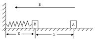 (20分)在绝缘水平面上,放一质量为m=2.0Χ10-3kg的带正电滑块A,所带电量为q=1.0Χ10-7C,在滑块A的左边处放置一个不带电、质量M=4.0Χ10-3kg的绝缘滑块B,B在左端接触(不连接)于固定在竖直墙壁的轻弹簧上,轻弹簧处于自然状态,弹簧原长S=0.05m,如图所示,在水平方向加一水平向左的匀强电场,电场强度的大小为E=4.0Χ105N/C,滑块A由静止释放后向左滑动并与滑块B发生碰撞,设碰撞时间极短,碰撞后结合在一起共同运动的速度为V=1m/s,两物体一起压缩弹簧至最短处(弹性限度内)时,弹簧的弹性势能E0=3.2Χ10-3J。设两滑块体积大小不计,与水平面间的动摩擦因数为μ=0.50,摩擦不起电,碰撞不失电,g 取10m/s2。求: