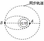 (12分)发射地球同步卫星时,先将卫星发射到距地面高度为h1的近地圆轨道上,在卫星经过A点时点火实施变轨进入椭圆轨道,最后在椭圆轨道的远地点B点再次点火将卫星送入同步轨道,如图所示。已知同步卫星的运动周期为T,地球的半径为R,地球表面重力加速度为g,求: