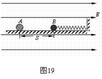 19.(丰台) (12分)如图19所示,劲度系数为k的轻弹簧,左端连着绝缘介质小球B,右端连在固定板上,放在光滑绝缘的水平面上。整个装置处在场强大小为E、方向水平向右的匀强电场中。现有一质量为m、带电荷量为+q的小球A,从距B球为S处自由释放,并与B球发生碰撞。碰撞中无机械能损失,且A球的电荷量始终不变。已知B球质量为A球质量的3倍,A、B小球均可视为质点。求: