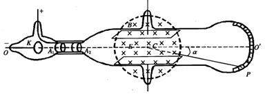 第二步:撤去电场,保持磁场和电子的速度不变,使电子只在磁场力的作用下发生偏转,打在荧屏上出现一个亮点P,通过推算得到电子的偏转角为α(CP与OO′下之间的夹角)。求:(1)电子在复合场中沿直线向右飞行的速度;