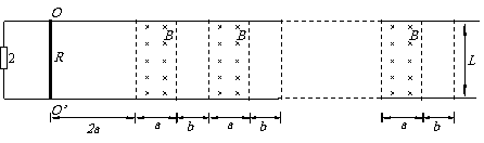 (3)若金属棒初速度为零,现对其施以水平向右的恒定拉力F,使棒进入各磁场的速度都相同,求金属棒从OO’开始运动到刚离开第n段磁场整个过程中导轨左端电阻上产生的热量。