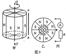 石景山11.某探究性学习小组研制了一种发电装置如图9中甲所示,图乙为其俯视图.将8块外形相同的磁铁交错放置组合成一个高h = 0.5 m、半径