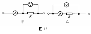17.(昌平)用伏安法测某一电阻时,如果采用如图12所示的甲电路,测量值为R1 ,如果采用乙电路,测量值为R2 ,那么R1 、R2与真实值R之间的大小关系为 。