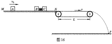 18.(12分)如图16所示为某种弹射装置的示意图,光滑的水平导轨MN右端N处与水平传送带理想连接,传送带长度 L = 4.0 m,皮带轮沿顺时针方向转动,带动皮带以恒定速率v = 3.0 m/s 匀速传动.三个质量均为m = 1.0 kg 的滑块A、B、C置于水平导轨上,开始时滑块B、C之间用细绳相连,其间有一压缩的轻弹簧,处于静止状态.滑块A以初速度v0 = 2.0 m/s 沿B、C连线方向向B运动,A与B碰撞后粘合在一起,碰撞时间极短.连接B、C的细绳受扰动而突然断开,弹簧伸展,从而使C与A、B分离.滑块C脱离弹簧后以速度vC = 2.0 m/s 滑上传送带,并从右端滑出落至地面上的P点.