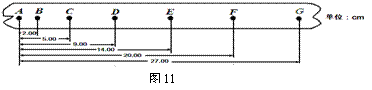 (2)(6分)在“探究速度随时间变化的规律”实验中,小车做匀变速直线运动,记录小车运动的纸带如图11所示.某同学在纸带上共选择7个计数点A、B、C、D、E、F、G,相邻两个计数点之间还有4个点没有画出.他量得各点到A点的距离如图所示,根据纸带算出小车的加速度为1 .0m/s2.则: