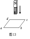 19.如图13所示,水平桌面上有一质量为m的铜质矩形线圈abcd,当一竖直放置的条形磁铁的S极从线圈正上方快速靠近线圈时,流过ab边的电流方向为