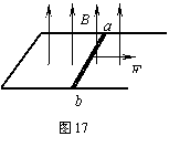 22.(昌平)(7分)如图17所示,水平U形光滑固定框架,宽度为L=1m,电阻忽略不计,导体棒ab的质量m = 0.2kg、电阻R = 0.5Ω,匀强磁场的磁感应强度B = 0.2T,方向垂直框架平面向上。现用F = 1N的外力由静止开始向右拉ab棒,当ab棒的速度达到5m/s时,求: