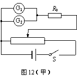 ①采用如图12(甲)所示的电路,测定电流表G2的内阻,得到电流表G1的示数I1、电流表G2的示数I2如下表所示: