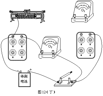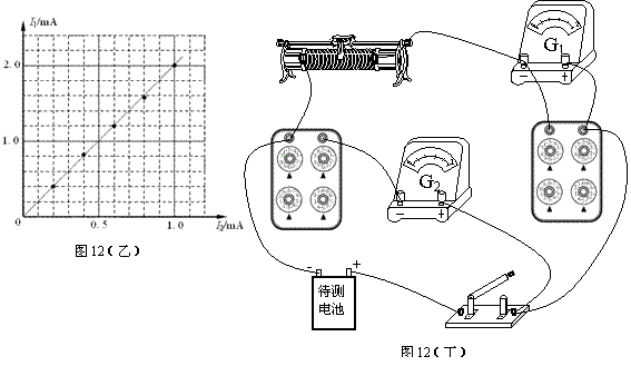 ②在现有器材的条件下,测量该电池电动势和内阻,采用如图12(丙)所示的电路.在给定的器材中,图中滑动变阻器①应该选用 ,电阻箱②应该选用 (均填写器材后面的代号).