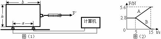 25. 如图(1)所示,均匀长方体木块长b=18cm,高h=16cm,宽L=10cm,被两个力传感器支撑起来,两传感器间距为a=10cm且到木块两边的距离相等,传感器能够将支撑点的受力情况通过数据采集器在计算机屏幕上反映出来。现用一弹簧测力计水平拉木块,拉力作用在木块的中点且缓慢均匀增大,木块则始终保持静止状态,计算机屏上出现如图(2)所示的图线。问: