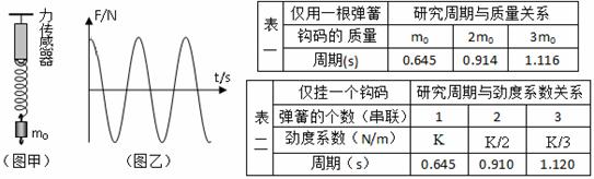 用力将钩码向下拉一段距离后放手,钩码上下振动,力传感器上显示出力随时间的变化关系(如图乙),改变钩码的个数或用几个弹簧串联后反复实验,得到表一、表二的数据: